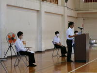 学級委員長として自分の務めを果たしたい1年生川畑くん、やってみようの気持ちをもって臨みたい2年生坂下くん、自分の決めた道で自分を磨くことを決意した3年生井之上くん、百戦錬磨を意識して精進したい生徒会森山さん。それぞれが堂々とした態度で発表することができ立派でした。