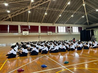 約1時間30分の公演でした。全校文化委員長の大木場さんのお礼の言葉を紹介します。「今日は私たちのために、このような素晴らしい機会をいただき、ありがとうございました。なかなか本物の舞台を観ることがない私たちにとって、刺激ある素敵な時間となりました。特に、役者の皆さんの迫力ある演技にびっくりし、とても感動しました。今日は、本当にありがとうございました。」