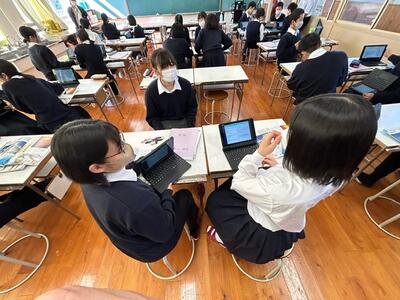 さて、普段の授業の様子をお伝えします。ICT機器(タブレットや大型TV)を常時使用しながら授業が進められいます。