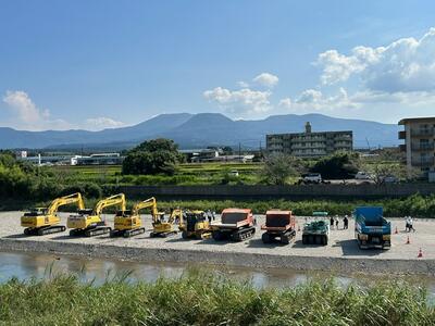 6日(金)の午後、飯野中近くの川内川において防災・減災に向けて作業を進めている建設業者(緒方組やコマツ宮崎 等)のお話を1年生が聞く機会をいただきました。川内川は大雨が降ると氾濫することもありますが、1年生は、地域の中において、災害を未然に防ぐための作業が、日常的に行われていることを学ぶことができました。