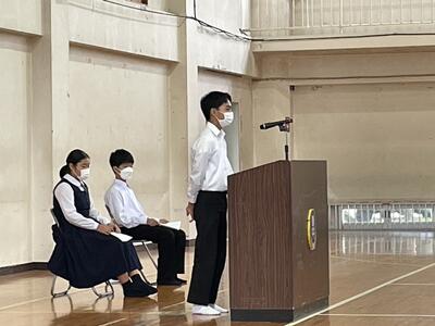 今日の始業式では、1・2・3年生、生徒会の代表者の「2学期の抱負」の発表がありました。