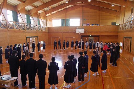 4月15日(木)に生徒会が主催して、新入生の歓迎行事が行われました。写真は、ひとことも声を出さずに、アイコンタクトと身振り手振りで52名全員が4月1日から3月31日の順に並ぶバースデーリングを行っている様子と楽しそうにジェスチャーゲームを行っている様子です。