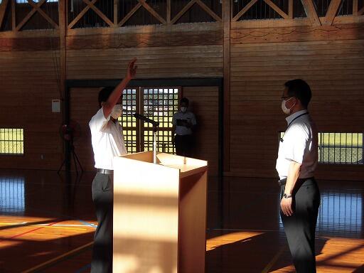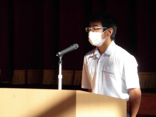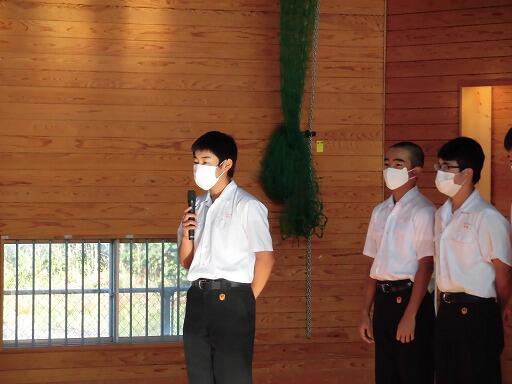 明日から始まる西諸地区中学校秋季体育大会に向けて激励会が行われました。各部活動キャプテンの決意の言葉、校長先生から激励の言葉、生徒からの激励の言葉が述べられました。そして、最後に選手を代表して野球部キャプテン永前竜馬くんの選手宣誓が行われました。選手の皆さんの活躍を祈っています。