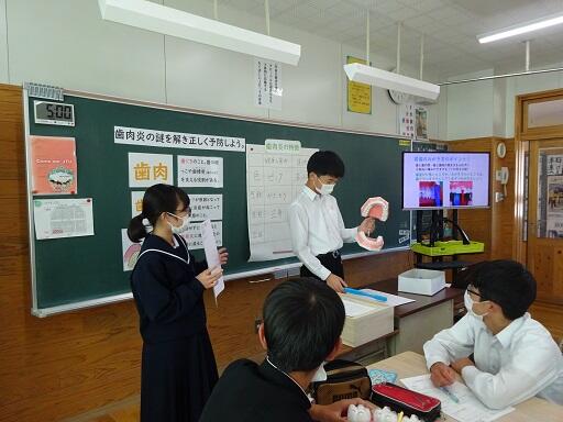 11月9日(月)に2年生学活の時間を使って歯科衛生講座を実施しました。養護教諭の髙牟禮先生の指導のもと歯の磨き方などの大切さを学びました。