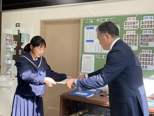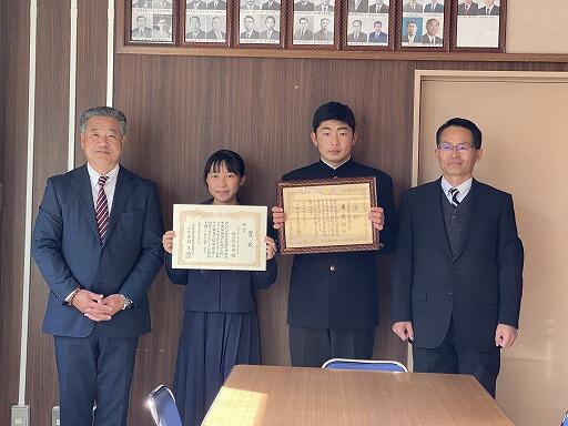 11月14日(月)に小林税務署長 吉田正嗣 様が来られて、校長室で租税作文表彰が行われました。3年 加治佐美琳さん(県租税作文銅賞) 東慶翔くん(小林税務署長賞) が表彰されました。また、ぜひいろいろなことにチャレンジしてください。
