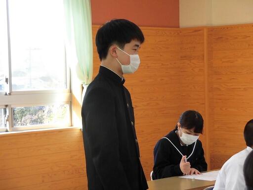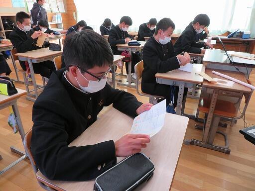 12月21日(月)に養護教諭の高牟禮先生も参加して、性教育等の授業が行われました。1年生の学活では「ストレス」についての授業が行われました。生徒はストレスと上手につきあっていくことを学びました。2年生は、「生命誕生」についての授業が行われました。保護者からの手紙を読み、自分の小さい頃のことを振り返りました。