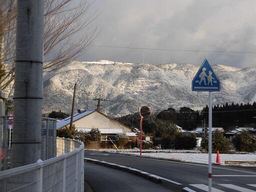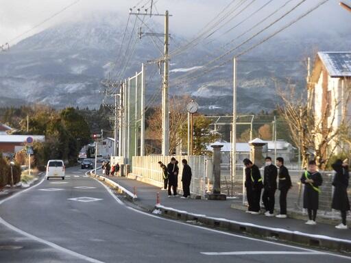 2月18日(火)の雪の朝の写真です。中学生あいさつ運動頑張っています。