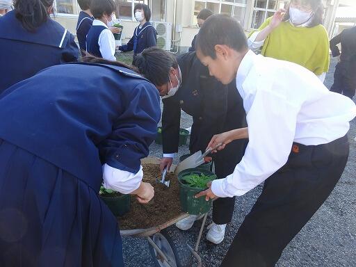 11月25日(水)昼休みに中学部全学年で「花いっぱい運動」の一貫で一人一鉢花を植えました。3月に卒業式で卒業生を送り、新入生を迎える花です。二階のベランダで毎日水をやり4月まで育てます。どんな花が咲くか、楽しみです。