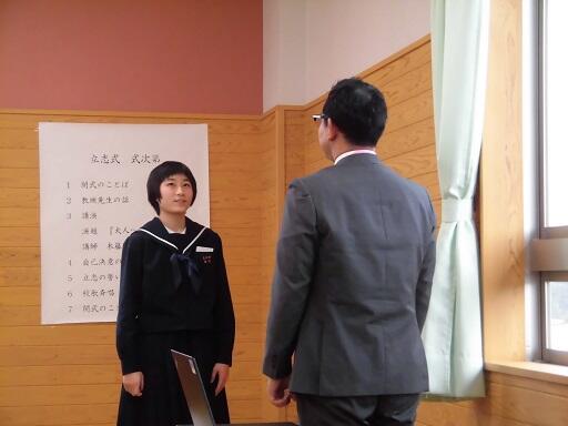 2月7日(金)に2年立志式が行われました。当日は、宮﨑観光ホテル、人事総務部長 木藤善二三 様より「大人への自覚」という題で講話をいただき、その後、生徒の自己決意の発表、立志の誓い、校歌斉唱と続きました。1つのいろいろな人間としての成長のきっかけになる機会になりました。