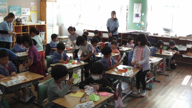 校内探検の後は、1年生が園児のみなさんに折り紙を教えました。