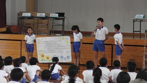 台風2号が静かに近付く6月1日(木)、小学部の全校集会がありました。