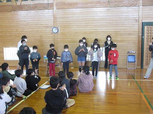① 体育館での説明(このとき、学年縦割りの10班に分けます。)
