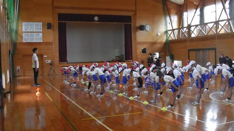 まず、礼の仕方を練習しました。5・6年生はさすが揃っています。
