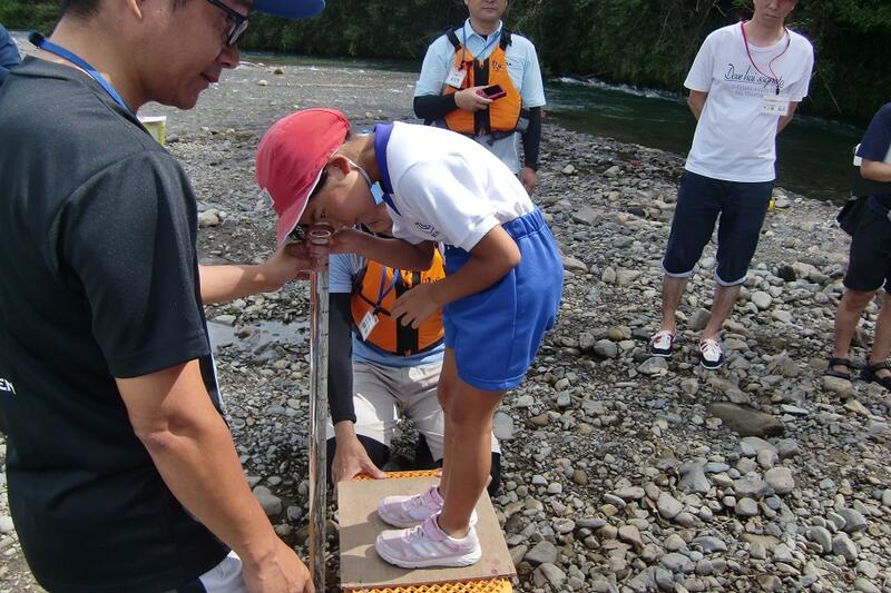 全員が川の中にライフジャケットを着て入り、生物を捕まえて観察したり水をすくっtたりして水質を調べました。