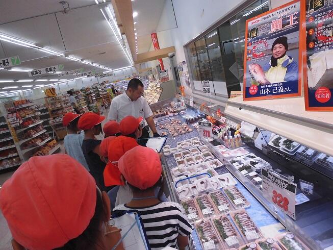 スーパーの入り口にはなぜ青果コーナーがあるのか、1日にどの位のお客様がいらっしゃるのかをお店の人に聞いたり、質問したりしてお店の秘密や工夫を学ぶことができました。