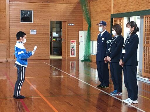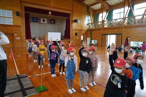 当日はあいにくの雨でしたので、交通指導を体育館で行っていただきました。