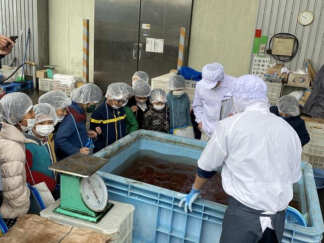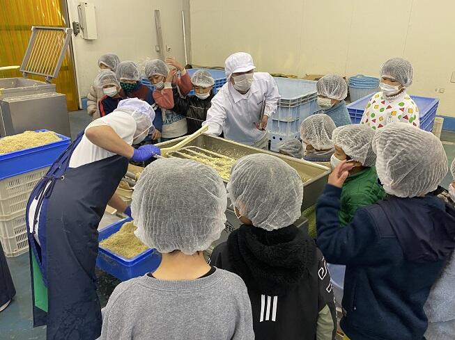 工場では、膨大な量の栗を見たことのない機械や人の手で調理していく過程の見学や、働く方々の苦労や工夫について、長時間にわたって学ばせていただきました。子どもたちは何度も積極的に質問を行い、地域の工場のことを学ぼうとしていました。