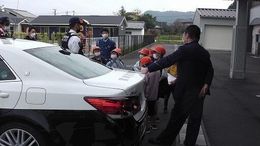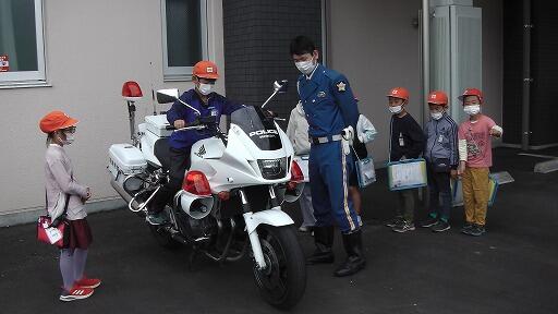 3階でDVDを見ながらお話を聞いた後、1階に下りて、パトカーや白バイを見学しました。