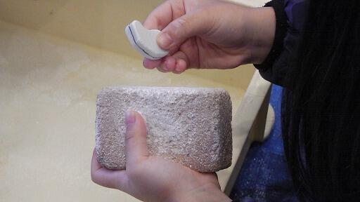 ①面取り…煉瓦(れんが)を使って、大まかにけずります。