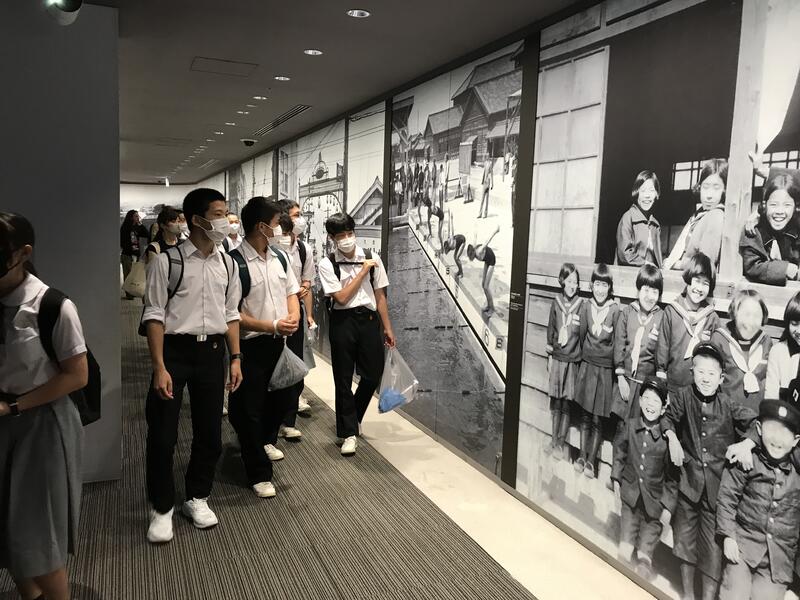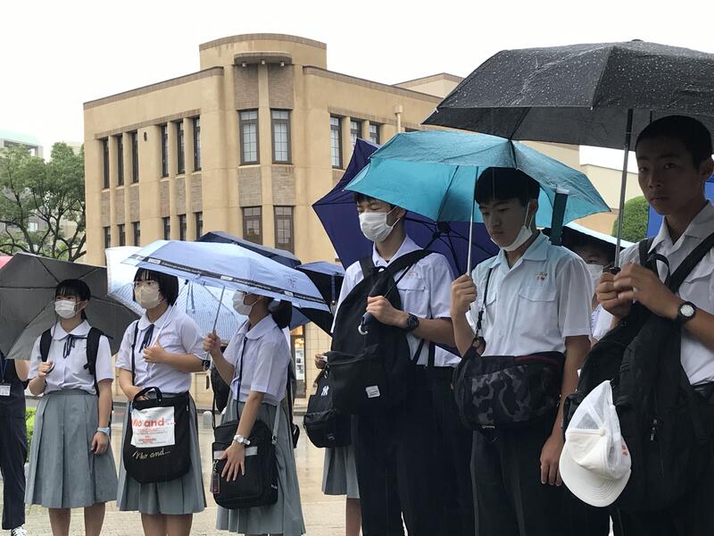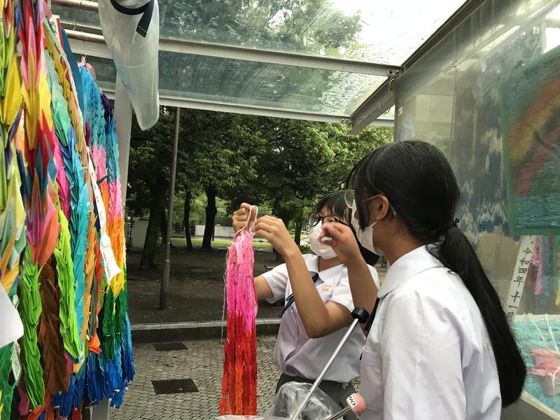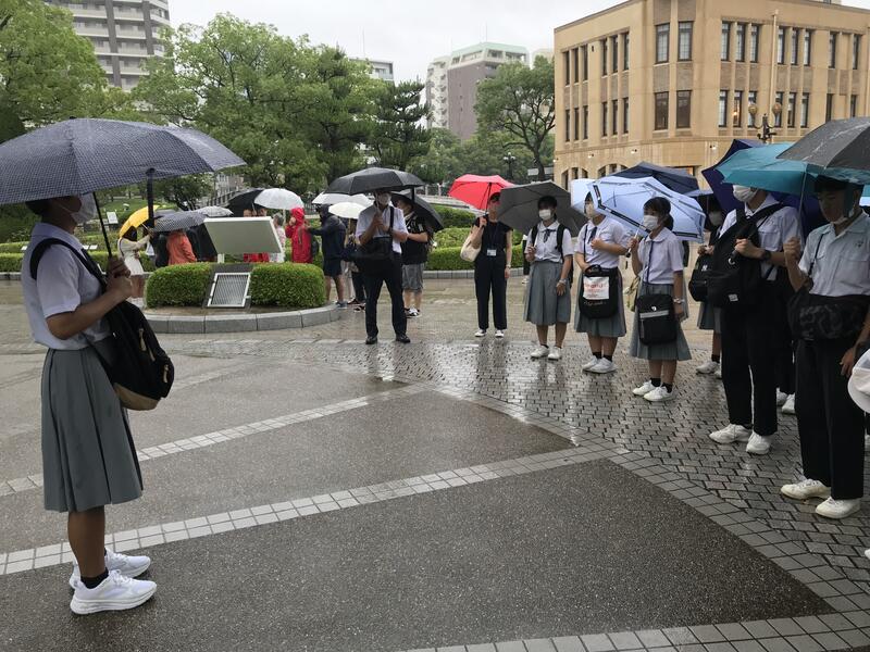 広島平和記念公園に移動し、平和集会を行いました。平和を誓い、平和の思いを込めた千羽鶴を奉納しました。