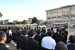今回は、JA共済連宮崎県本部の主催・ご協力の下、SUPER DRIVER'Sというスタントチームの皆さまと、JA共済連の方やえびの警察署の方々が訪れ、自動車や自転車の事故の様子の再現と講話を行っていただきました。人が車に衝突されてはね飛ばされる様子は、見ている人に非常に強いインパクトを与えるものでした。