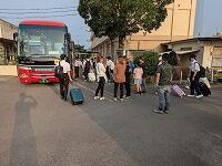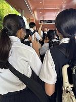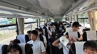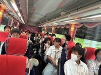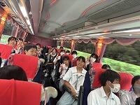 バスは一路、熊本県・八代へ。新幹線の出発駅に向かいます。バスの中は賑やかで、2年生の笑顔であふれています。楽しい旅を楽しんでください。