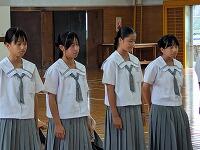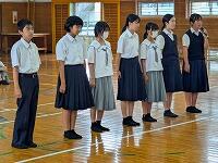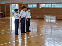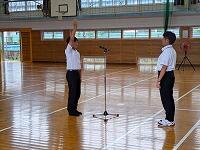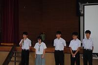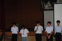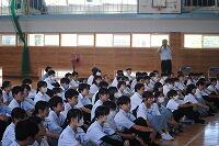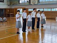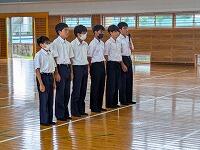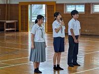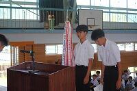 7月22日(火)1学期前半終了による全校集会が開かれました。最初に校長先生が1学期前半を振り返り、それぞれの学年の皆さんが特に頑張ったこと、印象に残ったことを話され、夏休み後も学校を盛り上げて欲しいという話をされ、次に担当の先生が夏休みの過ごし方について話をしてもらいました。最後に先日行われた中体連県大会の表彰と優勝旗の貢納を行いました。2位で九州大会に出場する空手型の生徒と、見事硬式テニスで男子団体戦を制した硬式テニス部の選手の快挙を全員でたたえました。夏休みを無事過ごし、九州大会での活躍を祈っています。