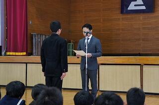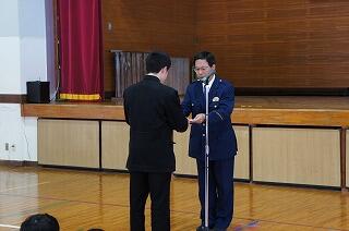 えびの警察署の交通課長、刑事生活安全課長の方々から交付証をいただいた後に、生徒会長による自転車利用五則の宣言を行いました。
