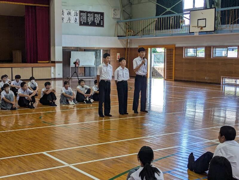 8月27日(火)1学期後半がスタートしました。最初に清掃を行い、その後、体育館で全校集会を行いました。集会では最初に社会を明るくする運動の標語部門で入賞した生徒の表彰を行い、その後、校長先生から生徒のみなさんが無事に夏休みを過ごし、登校してくれたことに対しての感謝の言葉と、これからの学校生活に向けて頑張って欲しいことの話がありました。集会の後は、もうすぐ行われる生徒会役員選挙に対しての説明を選挙管理委員会が行いました。もうすぐ新体制での加久藤中がスタートします。