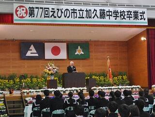 4月9日(火)加久藤中学校では、第78回入学式が行われました。本年度は、えびの市議会議長竹中様をはじめ、16名の来賓の方々に出席していただき、26名の新入生を迎えることができました。新入生のみなさんは緊張した表情で体育館の中央をゆっくりと歩き、席につきました。担任の先生の指名点呼には、大きな声ではっきりと返事を返し、無事、加久藤中の生徒になることができました。これから3年間、新入生が先輩たちや後輩たちと新しい加久藤中学校を作ってくれるのが、とても楽しみです。
