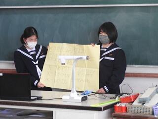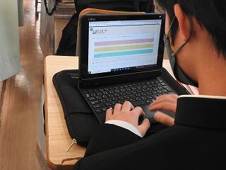 生徒たちは、それぞれの課題をタブレットで調べ、班内で共有しました。その後、全体で課題についてみんなで考え、最後に授業を通して気づいたことや感想を書いて今日の授業を終わりました。
