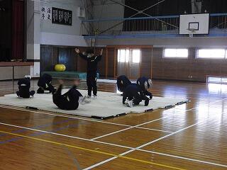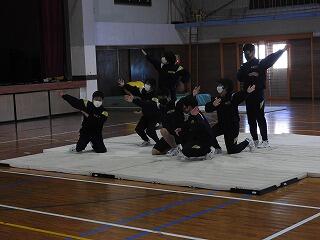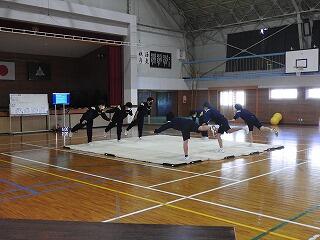 1グループ6~7名、それぞれ3グループの発表でした。中学3年生らしく、基本的な技の中に発展的な技が入り、考えられた構成になっていました。