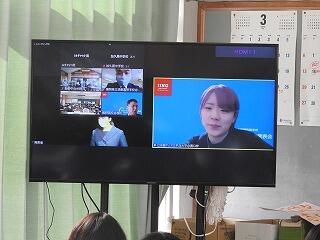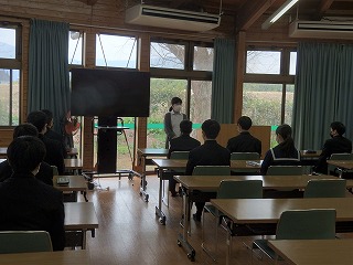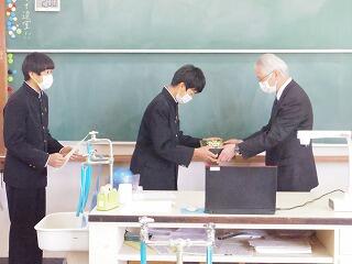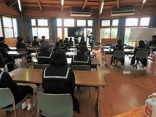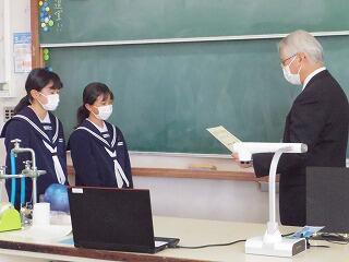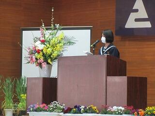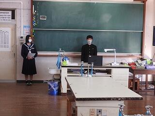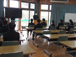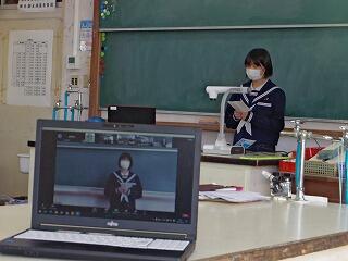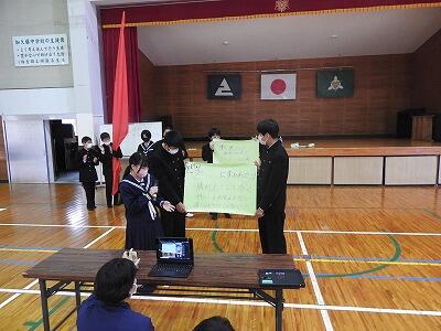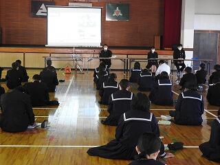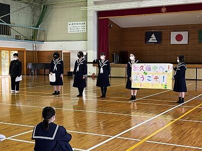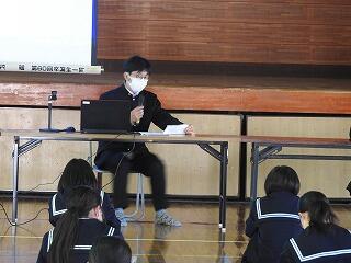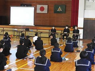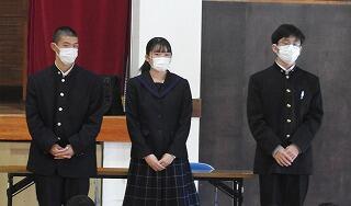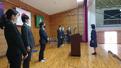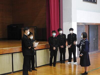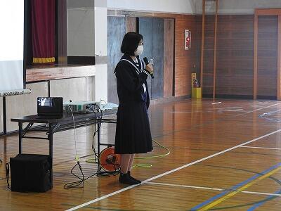 対面式では、校歌を紹介した後、生徒会長が歓迎のあいさつの中で、学校の取組等を紹介しました。