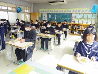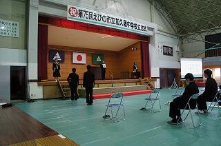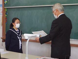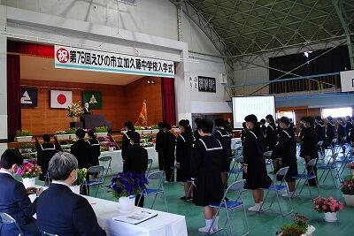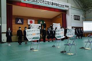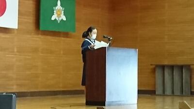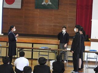 在校生の代表からは、新入生が入学してくることを楽しみに待っていたと歓迎の言葉を述べた後、中学校での生活の様子(委員会活動のことや部活動のこと)を紹介してくれました。また、「あいさつ日本一」を目指して頑張っていることも紹介してくれました。