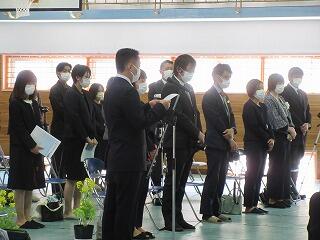 最初に、本年度加久藤中学校に赴任された先生方の新任式がありました。