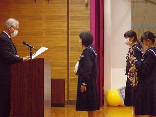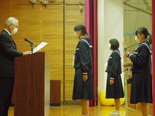 その後、11月7日に大分県で行われた、全日本マーチングバンド九州予選で金賞を獲得し、全国大会に推薦された吹奏楽部からトロフィーと表彰状の校納がありました。