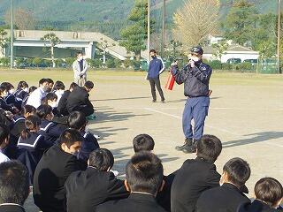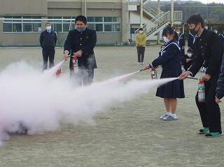今期は、西諸県広域消防の3名が指導に来てくださいました。火災の際に注意することなどの話をしていただいたのち、消火器の使い方を教わりました。