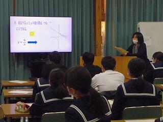 今回は数学、中でも苦手な生徒が多い関数の授業でした。参加した3年生は苦手分野を克服しようと真剣に授業に取り組んでいました。