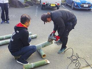 毎年、作っていただいているようですが、1年に1回のことなので、竹を斜めに切るところや縄の結び方など苦労をされていました。1時間半ほどの作業で、立派な門松が完成しました。