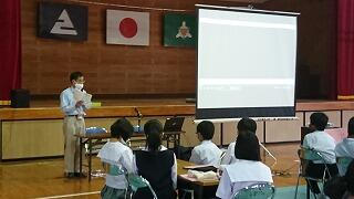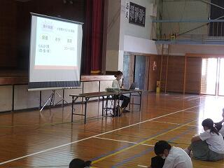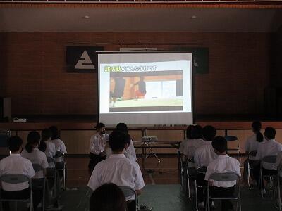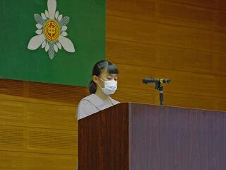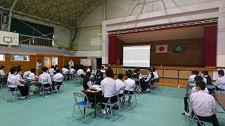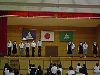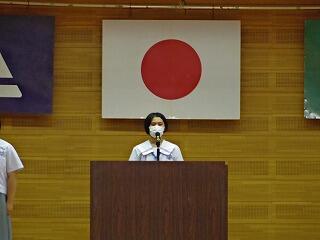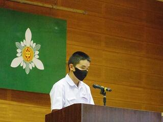 最初に、各学年の代表の3名の生徒が1学期を振り返り及び今後の目標等について発表しました。3名とも、自分の感じたことや考えたことを、自分の言葉でしっかりと発表することができました。