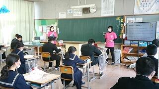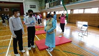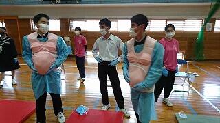 まず5校時は、教室で「思春期の身体と心の変化」や「性感染症」、「生命の誕生」などについて資料やプレゼン、動画を使って分かりやすくお話してくださいました。この世に生を受けるということがどれほど奇跡的なことかということについて理解できたと思います。続く6校時は、体育館で、「妊婦体験」「赤ちゃんのおむつ替え体験」「赤ちゃんの心音体験」等を行いました。各班に分かれてローテーションでそれぞれの体験活動を行いました。妊婦体験では、思わずバランスを崩して転倒しそうになる人がいたり、おむつ交換では慣れない手つきで苦戦する人がいたりと、普段はなかなかできない貴重な経験をしたことと思います。この経験を通して妊婦さんの気持ちや子育ての苦労なども理解できたのではないでしょうか? こうしてみなさんも元気に大きく育ってきたのです。ぜひ、お家の方への感謝の気持ちを忘れず、今日の体験をみなさんの将来に生かしてほしいと思います。