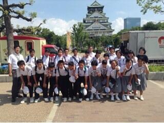 大阪城にて写真撮影。外国人旅行客の多さに生徒は驚いていました。