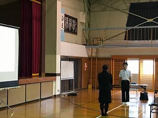 今回の避難訓練は、火山の噴火を想定したもので、空振や噴石などに対する対応を学習し、実際に各教室で避難行動を練習した後、体育館に移動し講師としてお招きしたえびの市役所基地・対策防災課の方のご講和を聞きました。