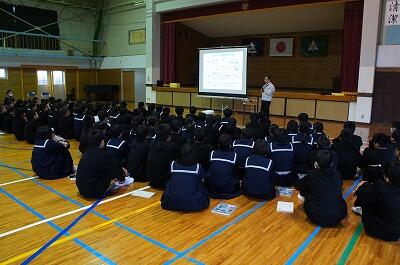 また、第2部では記念講演として、宮崎県海外協力協会より野邊節氏を招いて講演をしていただきました。国際協力に長年携わる中で経験してきた様々なことを分かりやすく話してくださいました。その中でも「夢≠職業」(夢は職業と同じではない)というお話に、生徒も職員も将来へ向けての希望をこれまでよりふくらませることができたように思います。わずか1時間足らずの講演でしたが、大変充実した講演となりました。