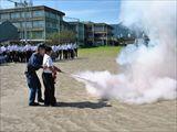 今回は生徒たちに事前に知らせることなく、移動教室も含む通常授業時に行い、より実践的な訓練をめざしました。突然の訓練だったのですが、全体的には落ち着いて行動できていたと思います。えびの消防署から来ていただいた消防職員より、注意するべき点について教えていただきました。生徒だけではなく、職員にとっても臨機応変な判断と行動を考えさせられる、非常に有意義な訓練になりました。