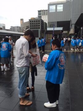 自主研修が終わってから、京都駅前でえびの米を配布し宣伝活動を行いました。関西えびの会の皆さんのご協力を頂きながら、190袋のお米を配り終えることができました。