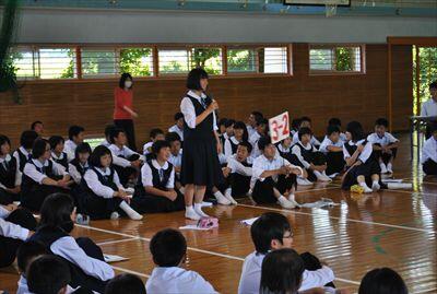 4日(木)に生徒総会が行われました。平成27年度の生徒会スローガンが「日進月歩」に決まり、各専門委員会からも今年度の活動目標が発表されました。