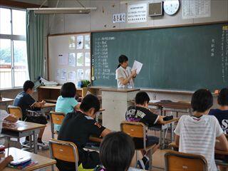 8月31日(月)  加久藤小学校の6年生が中学校にきて中学校の先生から授業を受けるという【体験授業】を実施しました。これは小中連携の1つで、中学校で1日授業を受けさせることで中学校の雰囲気にふれることと、中学校生徒との交流活動を通して中学生への親近感をもたせることをねらいとしています。