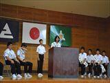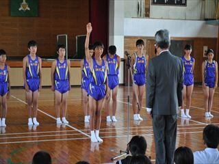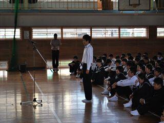 11月5日(木)に、中学校秋季体育大会陸上競技に出場する選手19名の激励会が行われました。生徒会代表のあいさつとして、全校美化委員長、2年1組美坂伊織君が激励の言葉を述べると、陸上部代表として2年2組坂本帝斗君が力強く選手宣誓をしてくれました。県大会は、11月7日(土)、8日(日)に行われます。