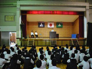 4日(木)に生徒総会が行われました。平成27年度の生徒会スローガンが「日進月歩」に決まり、各専門委員会からも今年度の活動目標が発表されました。